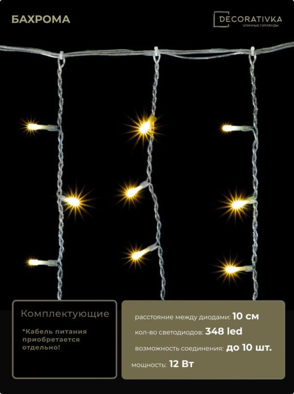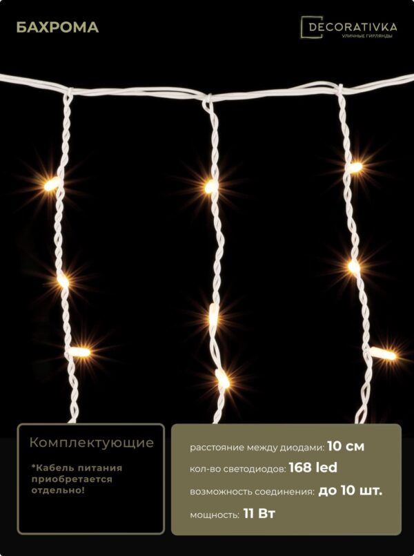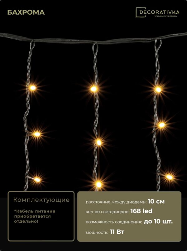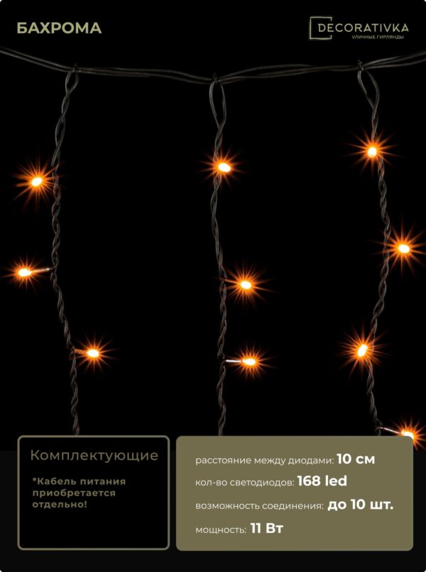 Гирлянда Бахрома 3,2 x 0,9 м Экстра Тепло-Белая с Мерцанием Белого Диода 220В, 168 LED, Провод Черный Каучук, IP65