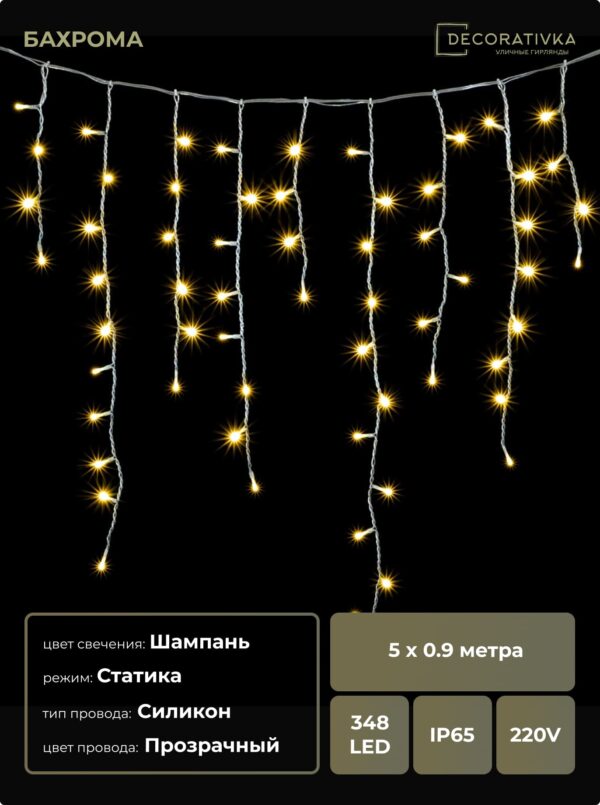 Гирлянда Бахрома 5 x 0,9 м Шампань 220В, 348 LED, Провод Прозрачный Силикон, IP65