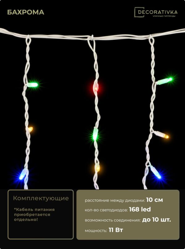 Гирлянда Бахрома 3,2 x 0,9 м Разноцветная 220В, 168 LED, Провод Белый Каучук, IP65