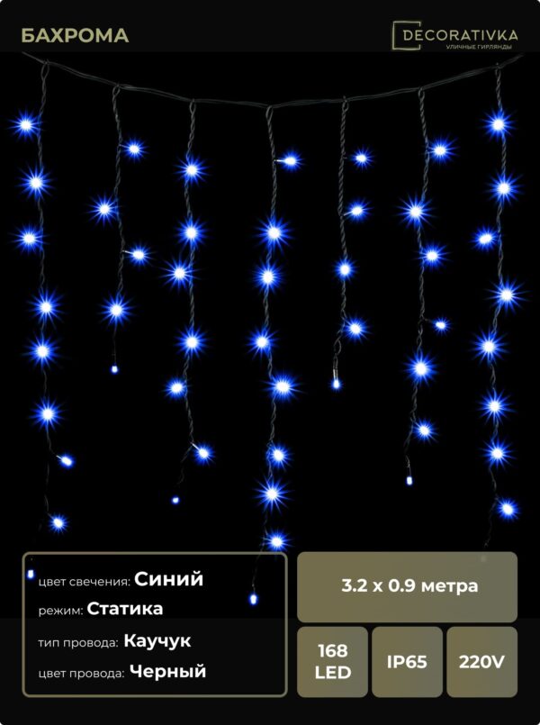 Гирлянда Бахрома 3,2 x 0,9 м Синяя 220В, 168 LED, Провод Черный Каучук, IP65