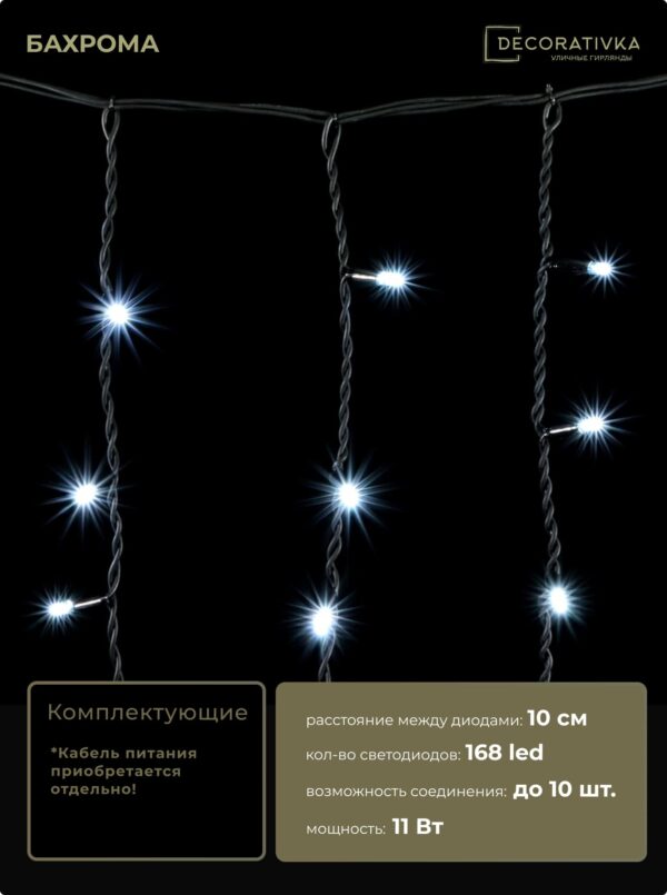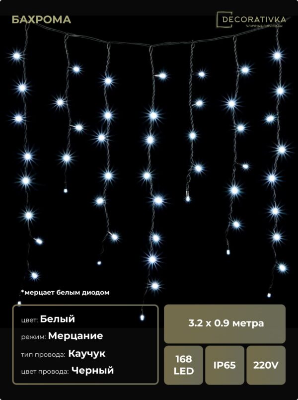 Гирлянда Бахрома 3,2 x 0,9 м Белая с Мерцанием Белого Диода 220В, 168 LED, Провод Черный Каучук, IP65
