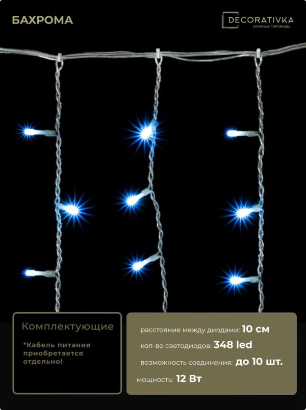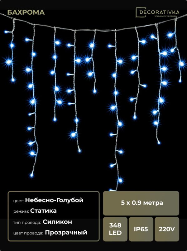 Гирлянда Бахрома 5 x 0,9 м Небесно-Голубая 220В, 348 LED, Провод Прозрачный Силикон, IP65