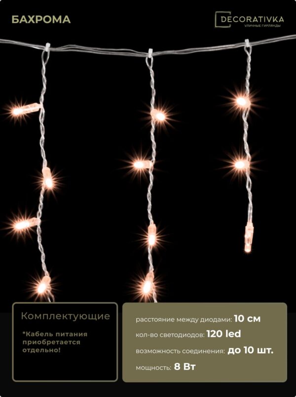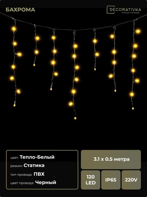 Гирлянда Бахрома с Колпачком 3,1 x 0,5 м Тепло-Белая 220В, 120 LED, Провод Черный ПВХ, IP65