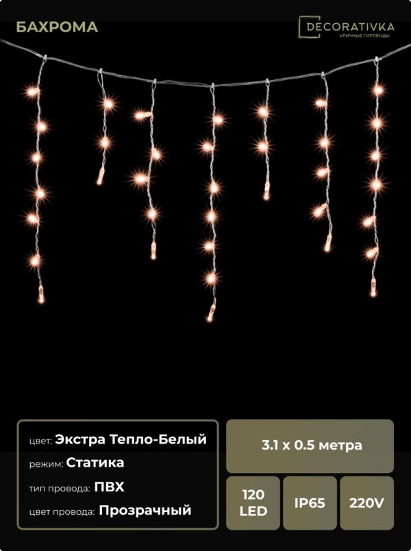 Гирлянда Бахрома с Колпачком 3,1 x 0,5 м Экстра Тепло-Белая 220В, 120 LED, Провод Черный ПВХ, IP65
