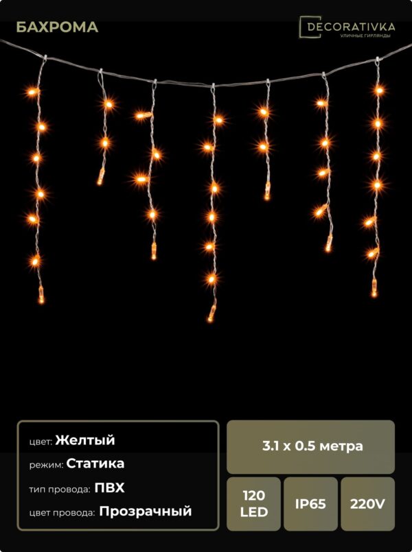 Гирлянда Бахрома с Колпачком 3,1 x 0,5 м Желтая 220В, 120 LED, Провод Прозрачный ПВХ, IP65