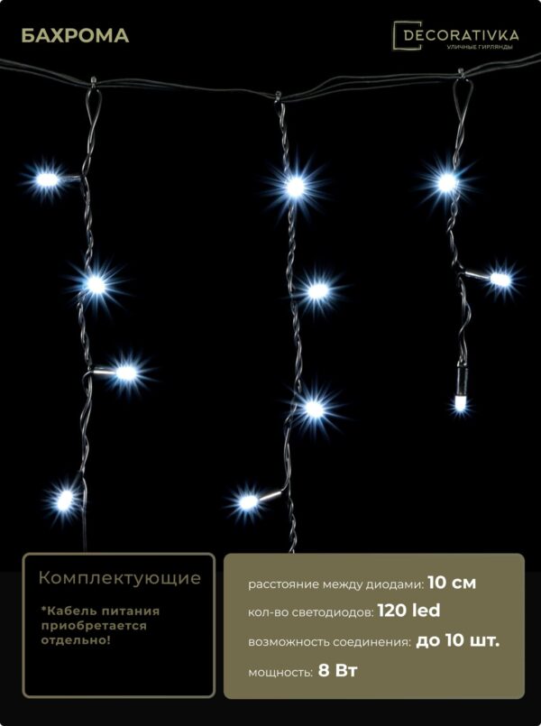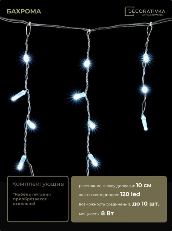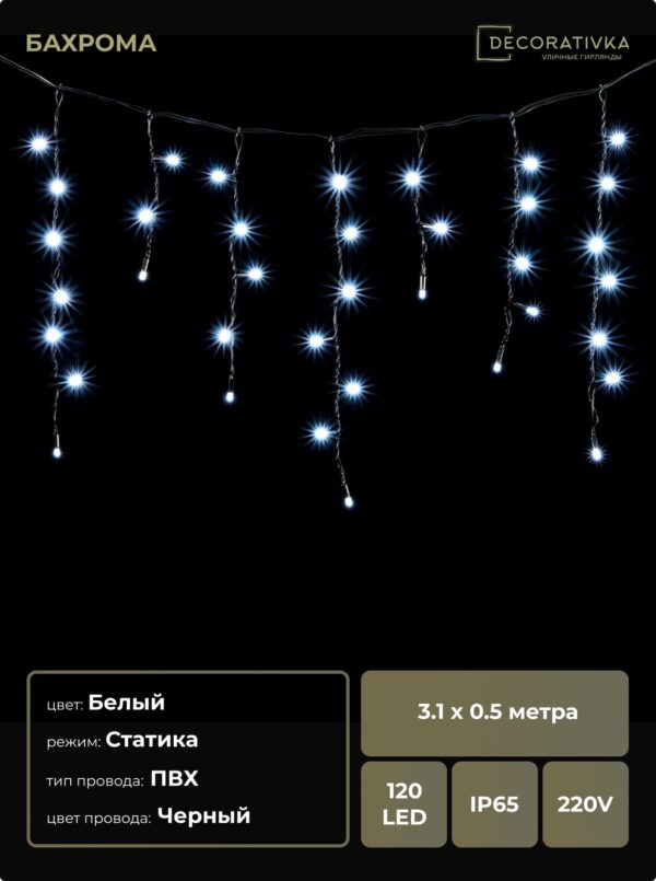Гирлянда Бахрома с Колпачком 3,1 x 0,5 м Белая 220В, 120 LED, Провод Черный ПВХ, IP65