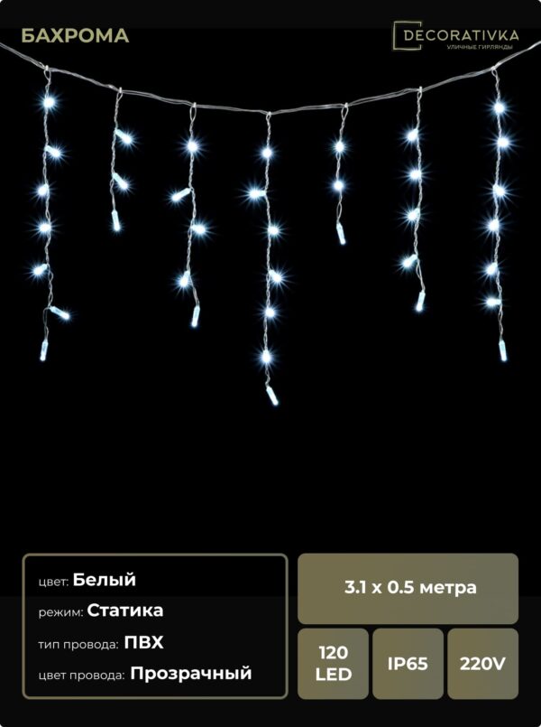 Гирлянда Бахрома с Колпачком 3,1 x 0,5 м Белая 220В, 120 LED, Провод Прозрачный ПВХ, IP65