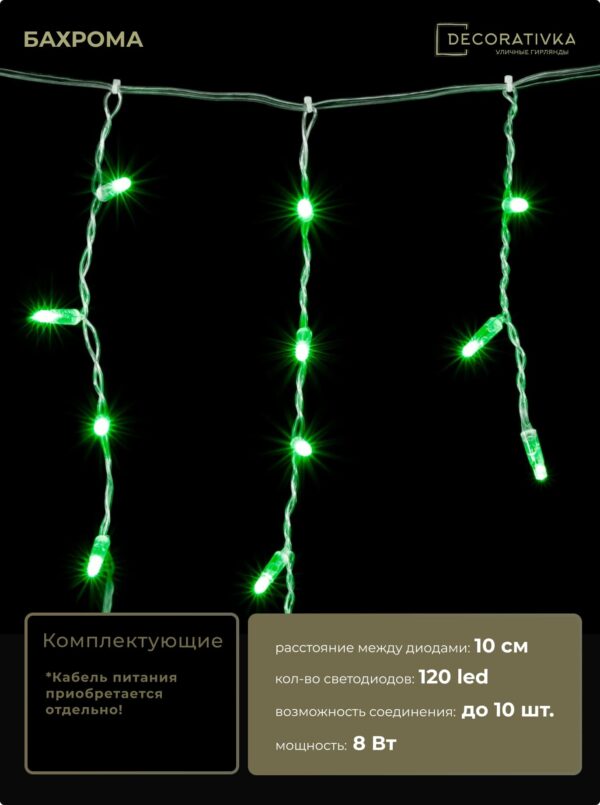 Гирлянда Бахрома с Колпачком 3,1 x 0,5 м Зелёная 220В, 120 LED, Провод Прозрачный ПВХ, IP65