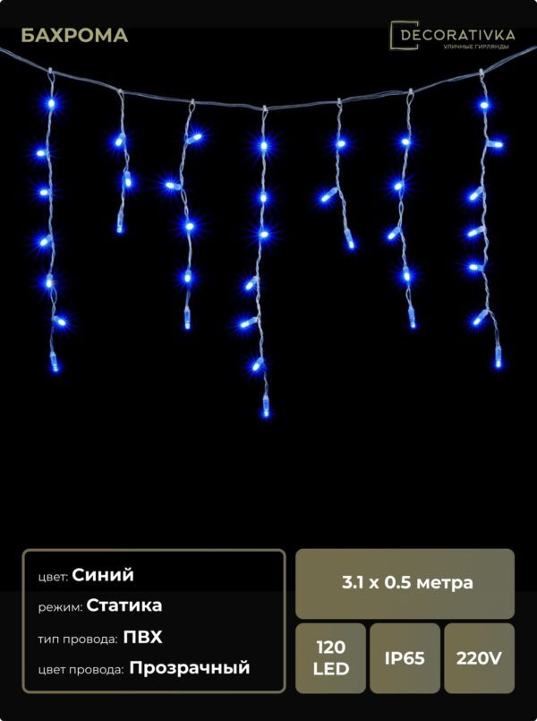 Гирлянда Бахрома с Колпачком 3,1 x 0,5 м Синяя 220В, 120 LED, Провод Прозрачный ПВХ, IP65