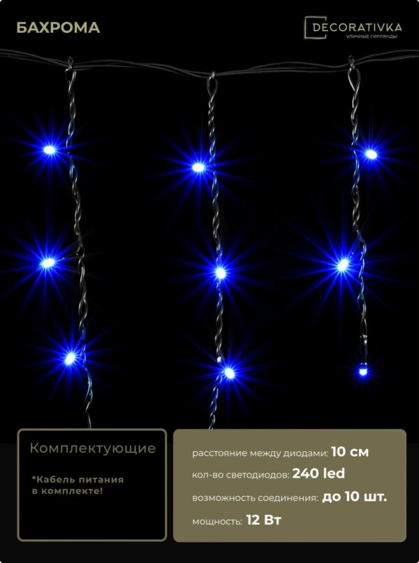 Гирлянда Бахрома 4,9 x 0,5 м Синяя 220В, 240 LED, Провод Черный ПВХ, IP54
