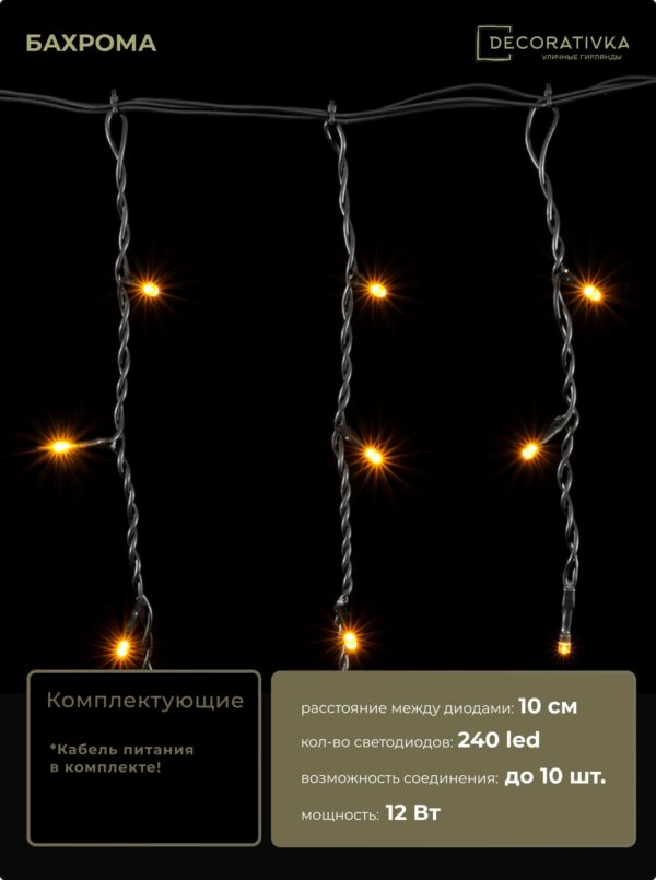 Гирлянда Бахрома 4,9 x 0,5 м Тепло-Белая 220В, 240 LED, Провод Черный ПВХ, IP54