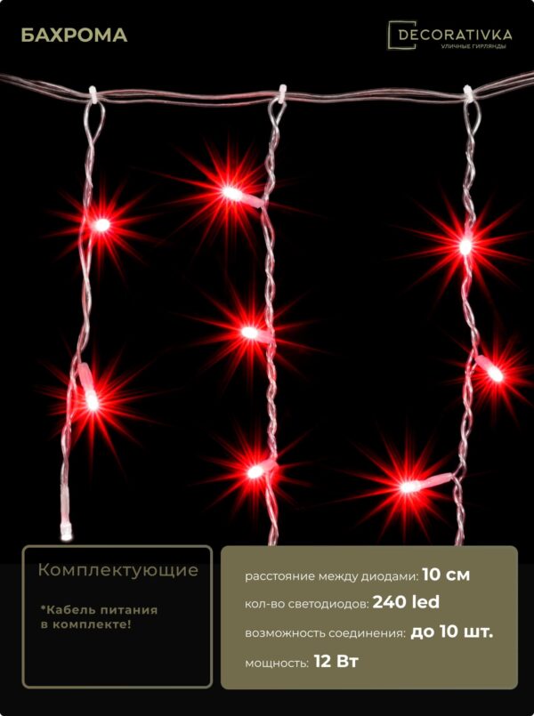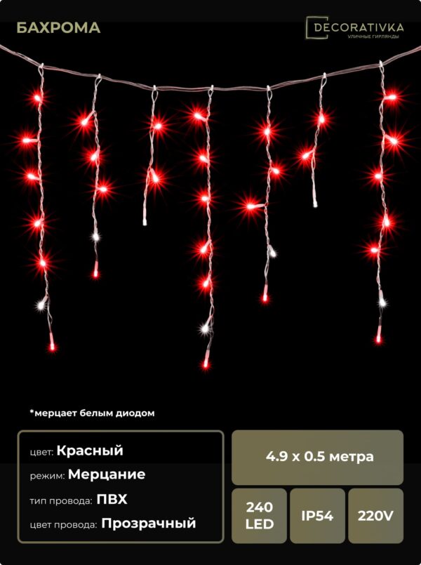 Гирлянда Бахрома 4,9 x 0,5 м Красная с Мерцанием Белого Диода 220В, 240 LED, Провод Прозрачный ПВХ, IP54