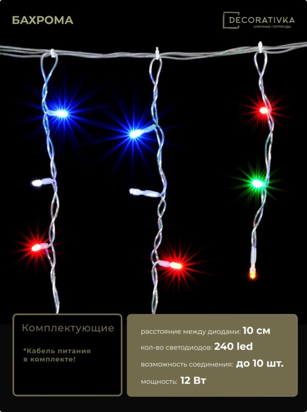 Гирлянда Бахрома 4,9 x 0,5 м Разноцветная с Мерцанием Белого Диода 220В, 240 LED, Провод Прозрачный ПВХ, IP54