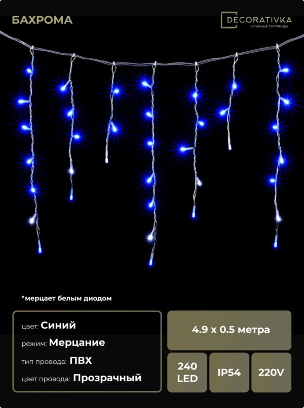 Гирлянда Бахрома 4,9 x 0,5 м Синяя с Мерцанием Белого Диода 220В, 240 LED, Провод Прозрачный ПВХ, IP54
