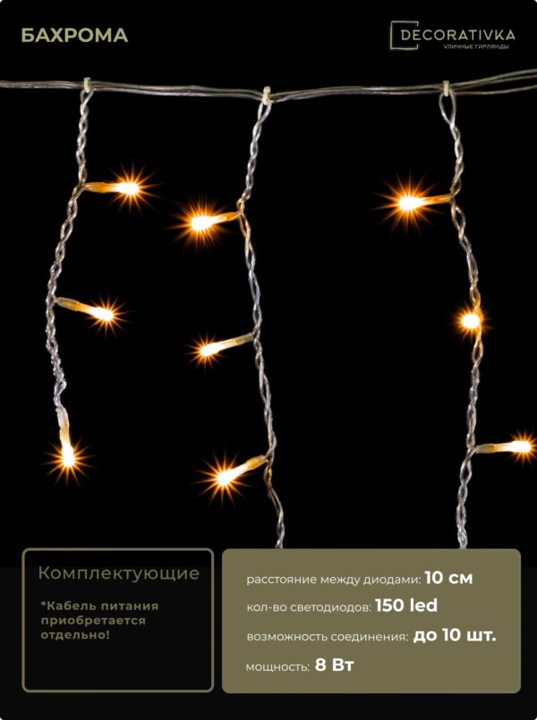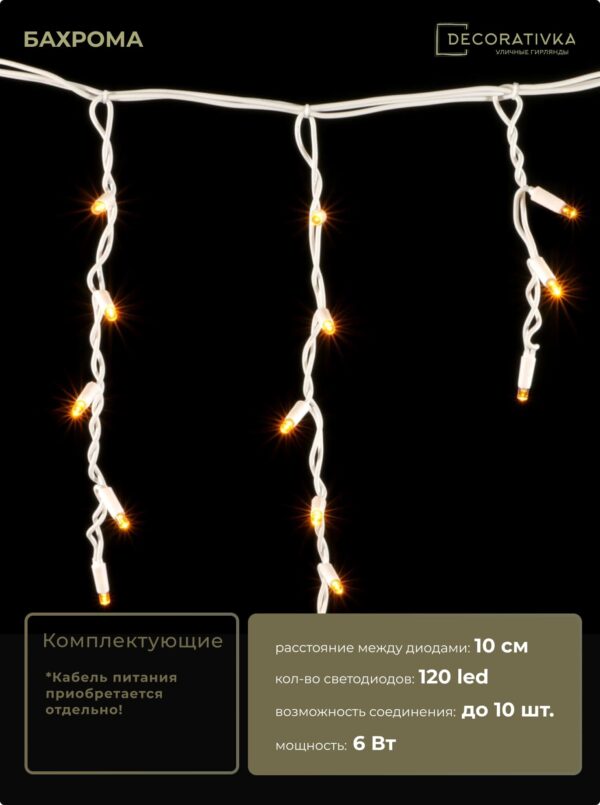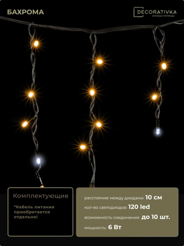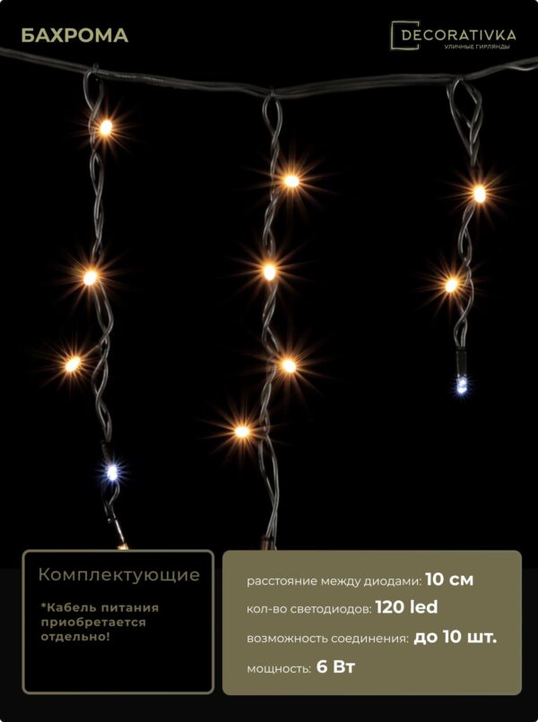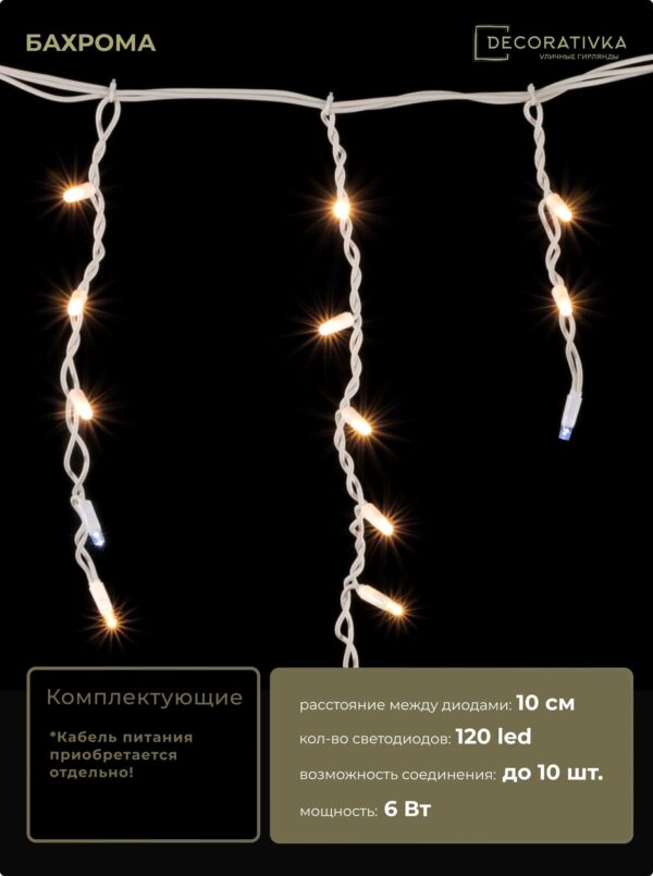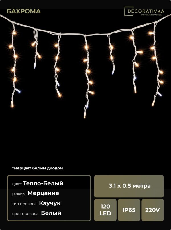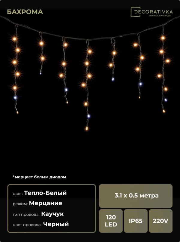Гирлянда Бахрома 3,1 x 0,5 м Тепло-Белая с Мерцанием Белого Диода 220В, 120 LED, Провод Черный Каучук, IP65