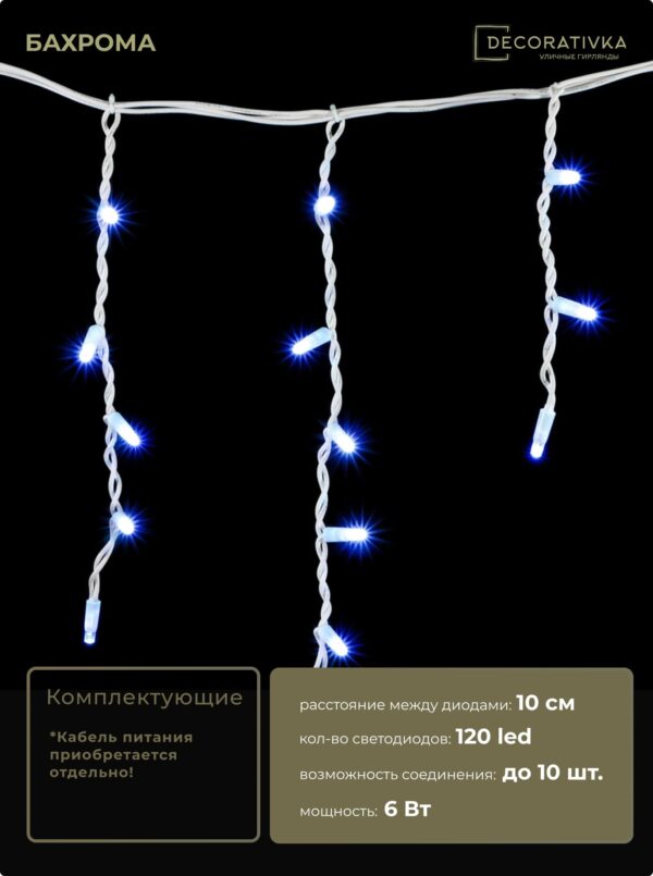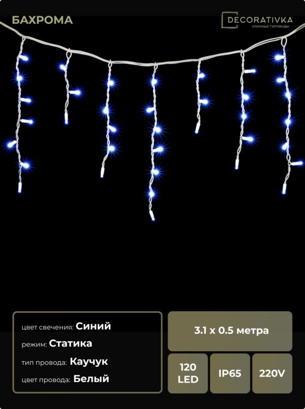 Гирлянда Бахрома 3,1 x 0,5 м Синяя 220В, 120 LED, Провод Белый Каучук, IP65