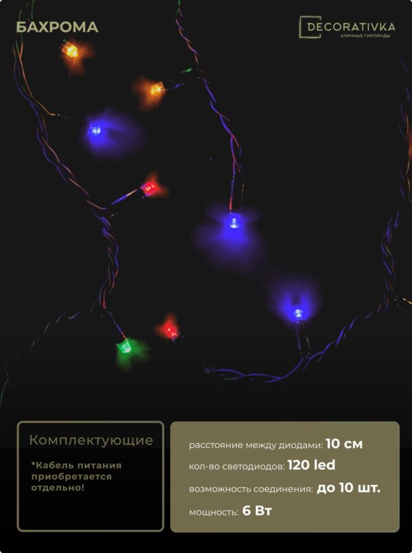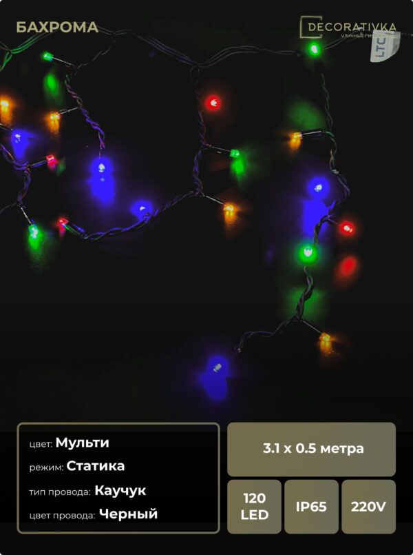 Гирлянда Бахрома 3,1 х 0,5 м Разноцветная 220В, 120 LED, Провод Черный Каучук, IP65