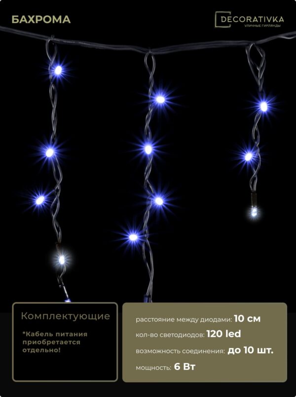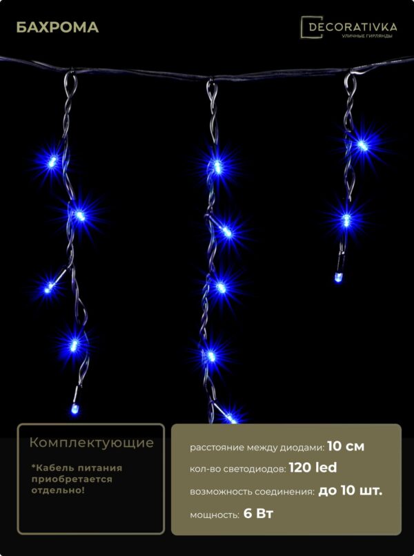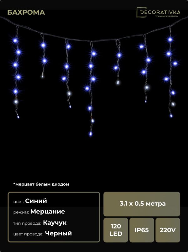 Гирлянда Бахрома 3,1 x 0,5 м Синяя с Мерцанием Белого Диода 220В, 120 LED, Провод Черный Каучук, IP65