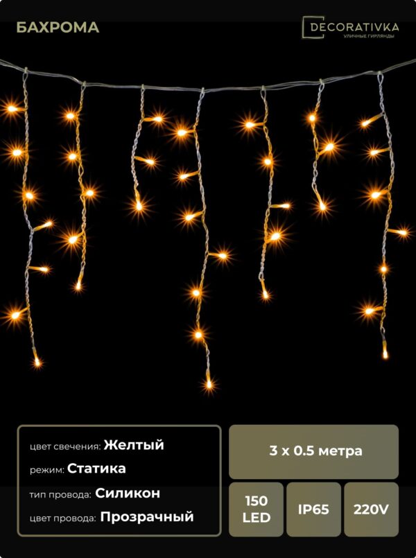 Гирлянда Бахрома 3 x 0,5 м Желтая 220В, 150 LED, Провод Прозрачный Силикон, IP65