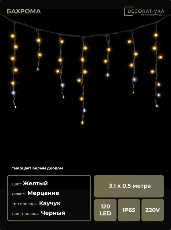 Гирлянда Бахрома 3,1 x 0,5 м Жёлтая с Мерцанием Белого Диода 220В, 120 LED, Провод Черный Каучук, IP65