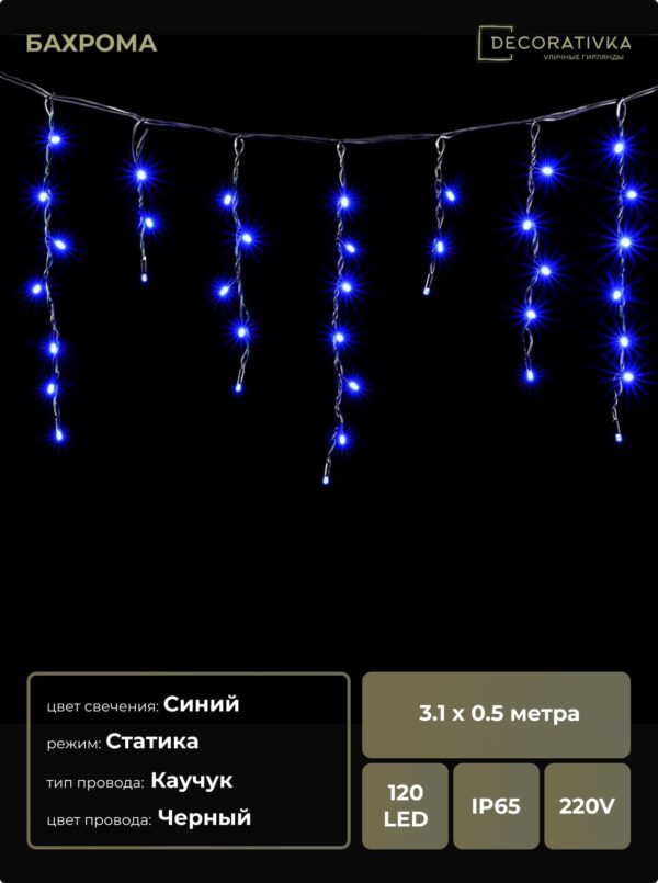 Гирлянда Бахрома 3,1 x 0,5 м Синяя 220В, 120 LED, Провод Черный Каучук, IP65