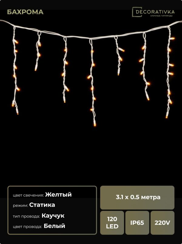 Гирлянда Бахрома 3,1 x 0,5 м Желтая 220В, 120 LED, Провод Белый Каучук, IP65