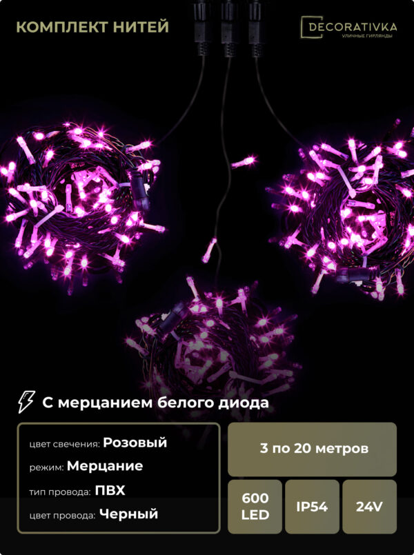 Комплект 3 Розовых Нити с Мерцанием Белого Диода по 20м, 600 LED, Провод Черный ПВХ, IP54