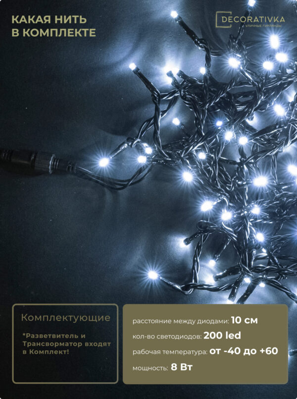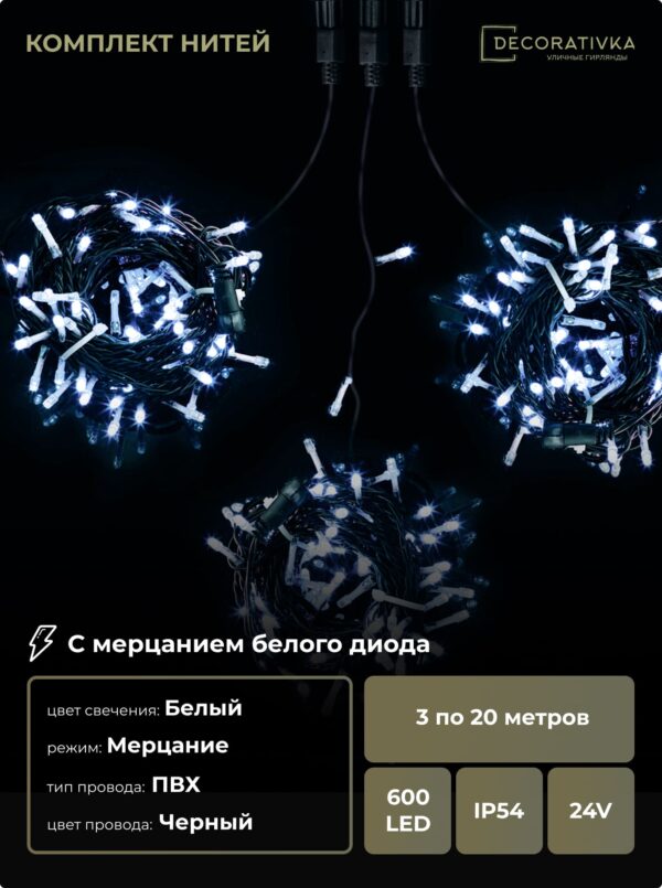 Комплект 3 Белых Нити по 20м, 600 LED, Провод Черный ПВХ, IP54