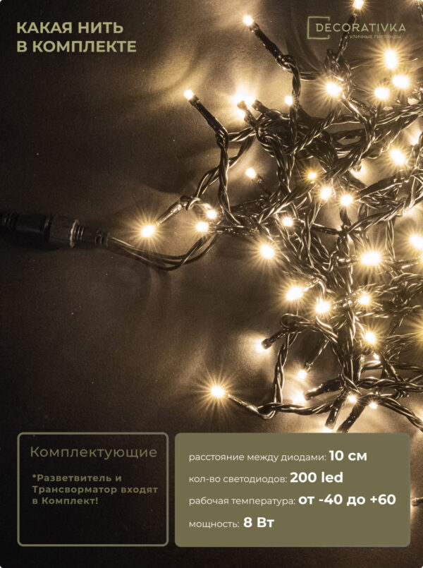 Комплект 3 Тепло-Белых Нити по 20м, 600 LED, Провод Черный ПВХ, IP54