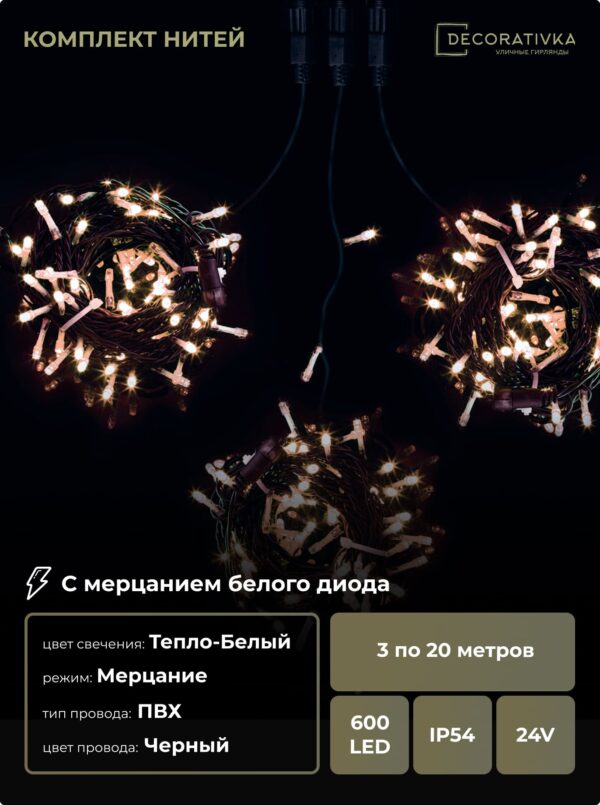 Комплект 3 Тепло-Белых Нити с Мерцанием Белого Диода по 20м, 600 LED, Провод Черный ПВХ, IP54