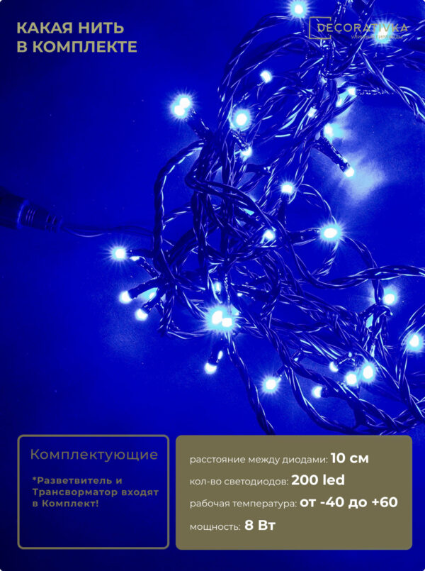 Комплект 3 Синих Нити по 20м, 600 LED, Провод Черный ПВХ, IP54