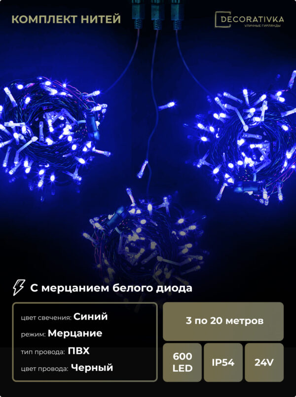 Комплект 3 Синих Нити с Мерцанием Белого Диода по 20м, 600 LED, Провод Черный ПВХ, IP54