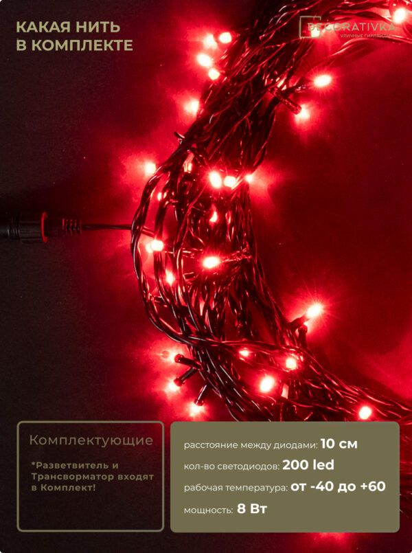 Комплект 3 Красных Нити с Мерцанием Белого Диода по 20м, 600 LED, Провод Черный ПВХ, IP54