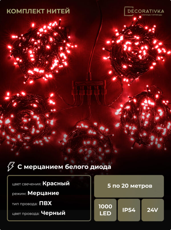 Комплект 5 Красных Нитей по 20м с Мерцанием Белого Диода, 1000 LED, Провод Черный ПВХ, IP54