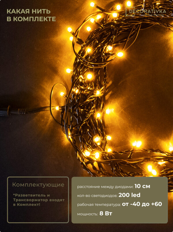 Комплект 3 Желтых Нити с Мерцанием Белого Диода по 20м, 600 LED, Провод Черный ПВХ, IP54