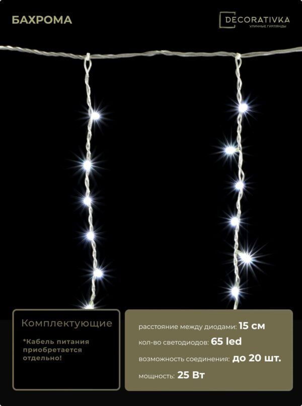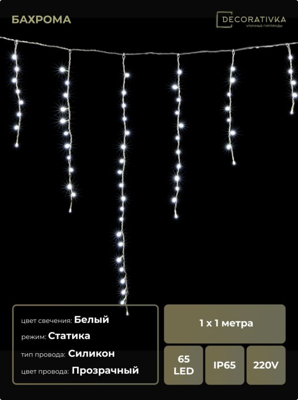 Гирлянда Бахрома 1 x 1 м Белая 220В, 65 LED, Провод Прозрачный Силикон, IP65