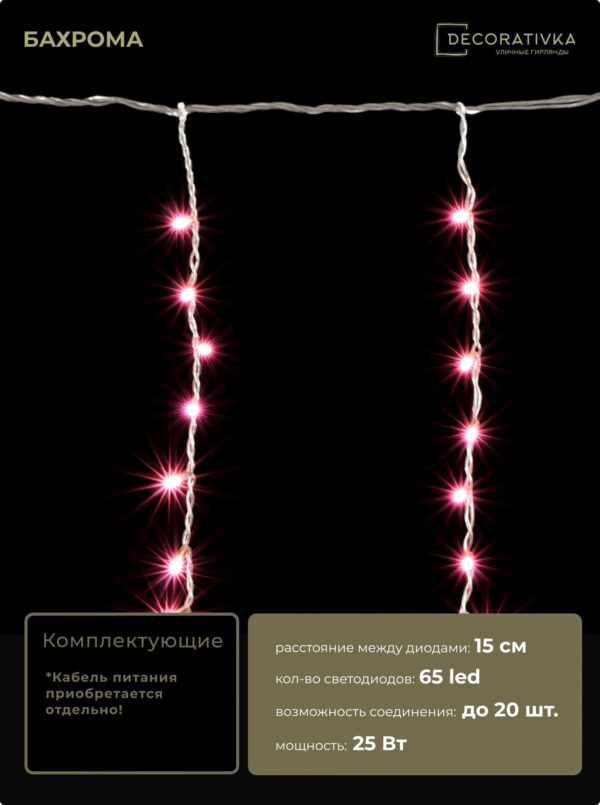 Гирлянда Бахрома 3,1 x 0,5 м Розовая 220В, 150 LED, Провод Прозрачный ПВХ, IP54