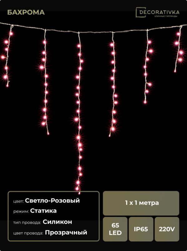 Гирлянда Бахрома 1 x 1 м Светло-Розовая 220В, 65 LED, Провод Прозрачный Силикон, IP65