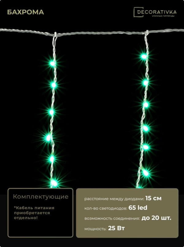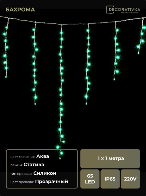 Гирлянда Бахрома 1 x 1 м Аква 220В, 65 LED, Провод Прозрачный Силикон, IP65