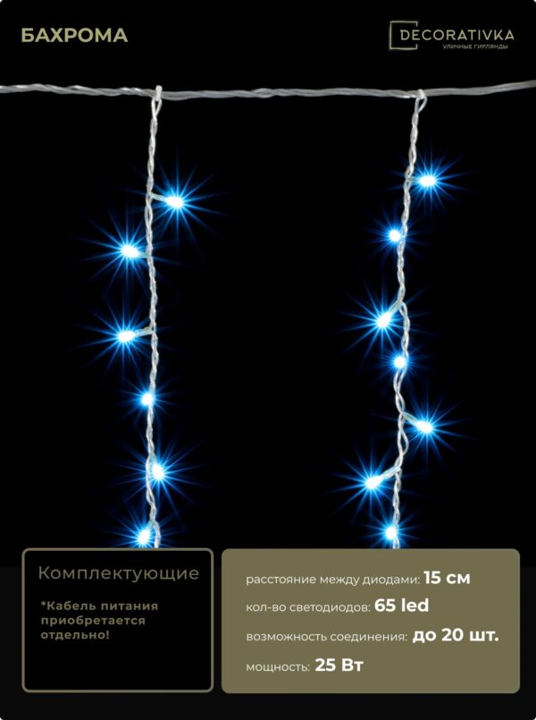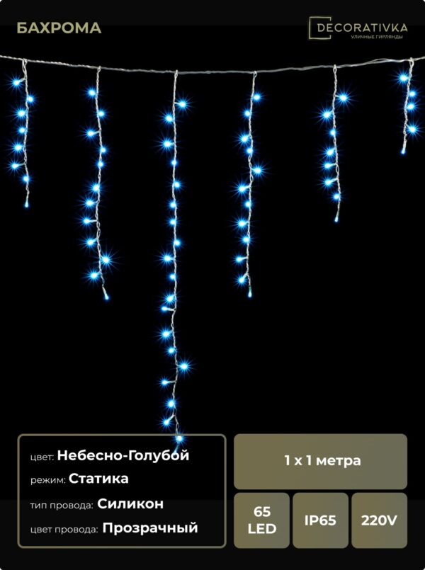 Гирлянда Бахрома 1 x 1 м Небесно-Голубая 220В, 65 LED, Провод Прозрачный Силикон, IP65