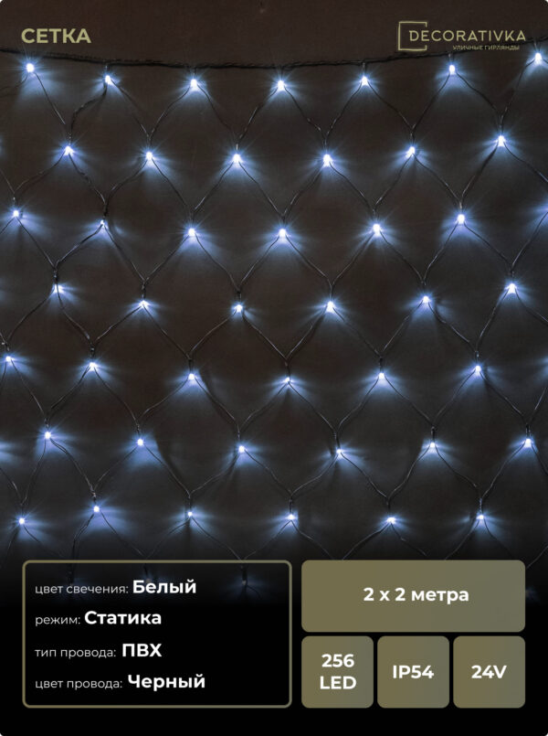 Светодиодная Сеть 2 x 2 м Белая 24В, 256 LED, Провод Черный ПВХ, IP54
