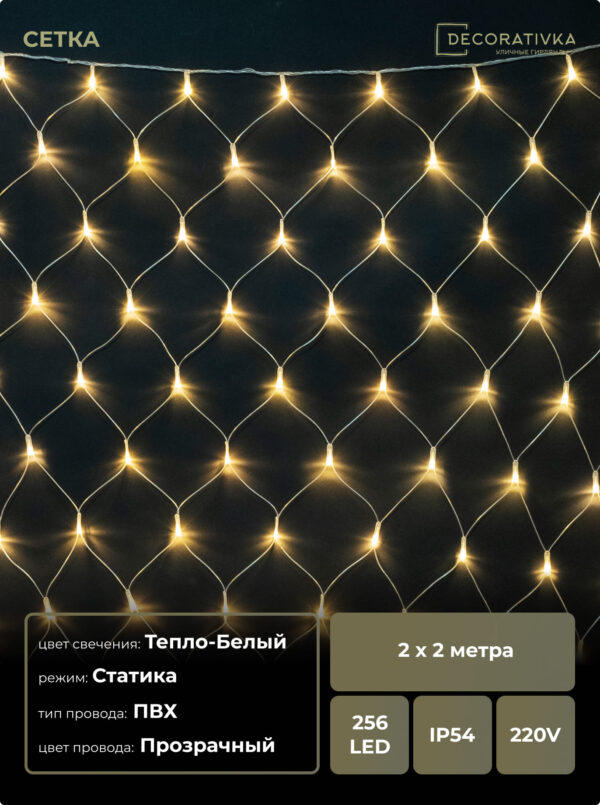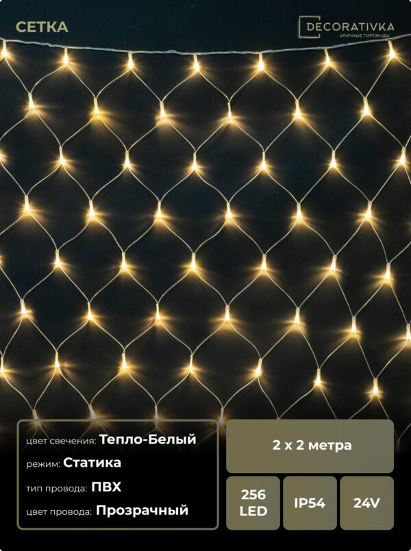 Светодиодная Сеть 2 x 2 м Тепло-Белая 24В, 256 LED, Провод Прозрачный ПВХ, IP54