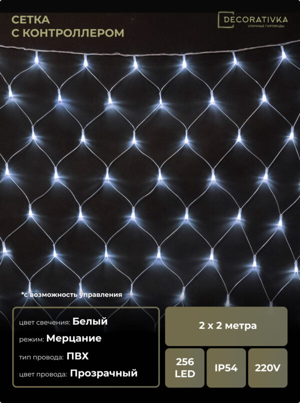 Светодиодная Сеть 2 x 2 м Белая с Контроллером 220В, 256 LED, Провод Прозрачный ПВХ, IP54