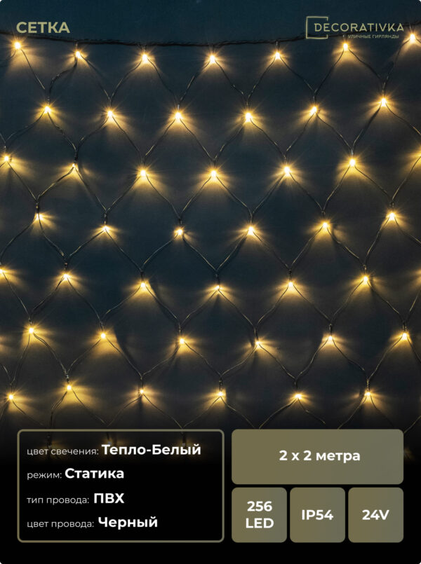 Светодиодная Сеть 2 x 2 м Тепло-Белая 24В, 256 LED, Провод Черный ПВХ, IP54