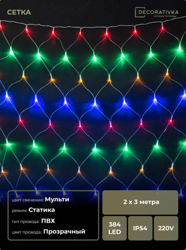 Светодиодная Сеть 2 x 3 м Разноцветная 220В, 384 LED, Провод Прозрачный ПВХ, IP54
