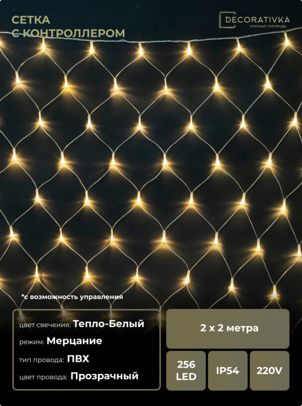 Светодиодная Сеть 2 x 2 м Тепло-Белая с Контроллером 220В, 256 LED, Провод Прозрачный ПВХ, IP54
