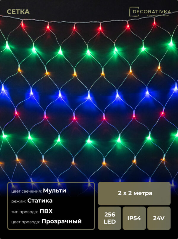 Светодиодная Сеть 2 x 2 м Разноцветная 24В, 256 LED, Провод Прозрачный ПВХ, IP54