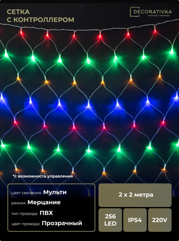 Светодиодная Сеть 2 x 2 м Разноцветная с Контроллером 220В, 256 LED, Провод Прозрачный ПВХ, IP54