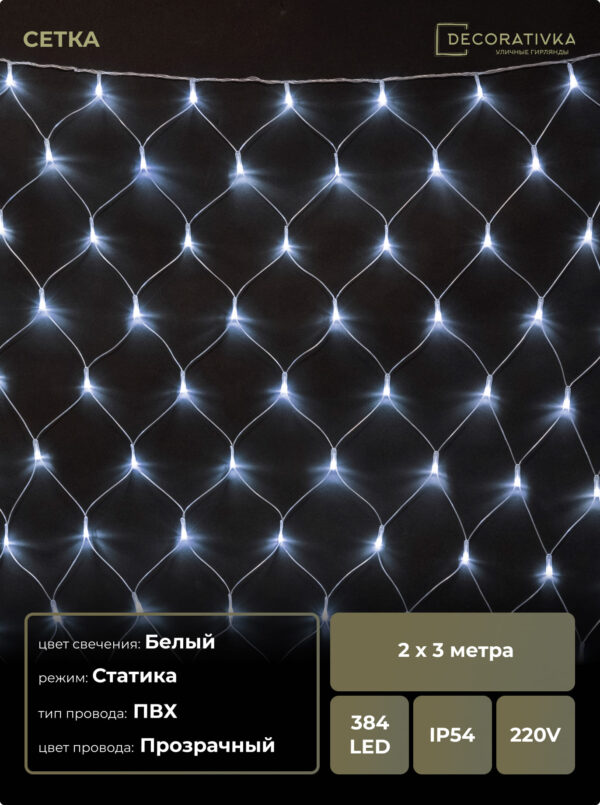 Светодиодная Сеть 2 x 3 м Белая 220В, 384 LED, Провод Прозрачный ПВХ, IP54