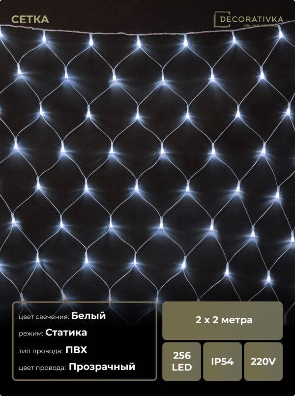 Светодиодная Сеть 2 x 2 м Белая 220В, 256 LED, Провод Прозрачный ПВХ, IP54